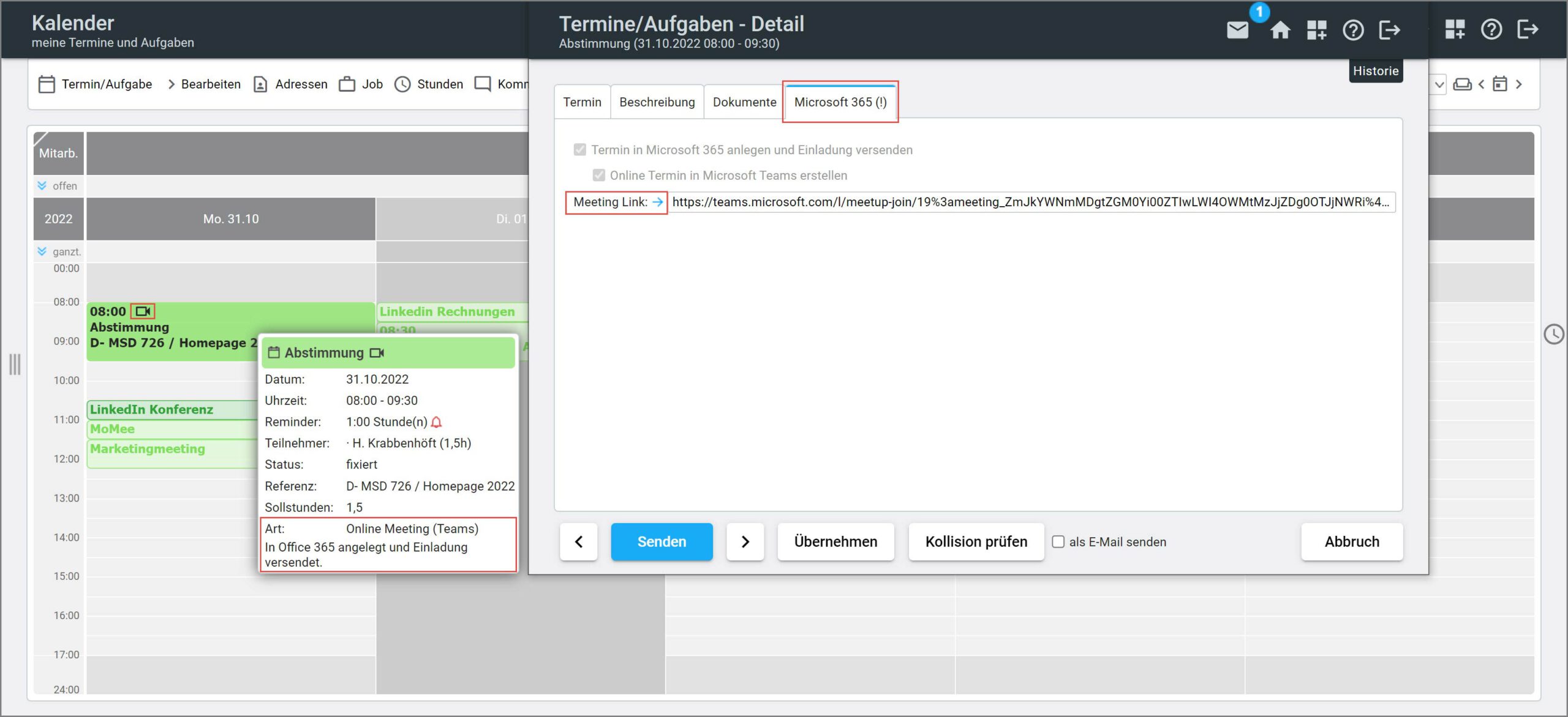 Sofern angehakt, wird zusätzlich ein entsprechender Meeting-Link für den Termin generiert und hinterlegt. Der Termin ist im easyJOB-Kalender mit dem Kamera-Icon gekennzeichnet und wird zusätzlich im Teams-Kalender eingetragen. Mit Klick auf den Aktionspfeil öffnen Sie das Teams-Besprechungs-Fenster und nehmen am Meeting teil.