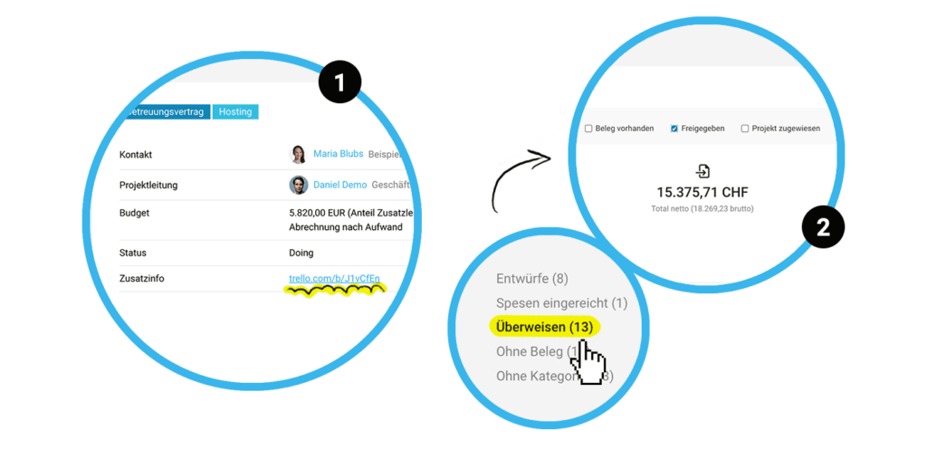 - Automatisch verlinkte URLs: Links in Zusatzinfos, Abrechnungsinfos und eigenen Feldern sind klickbar