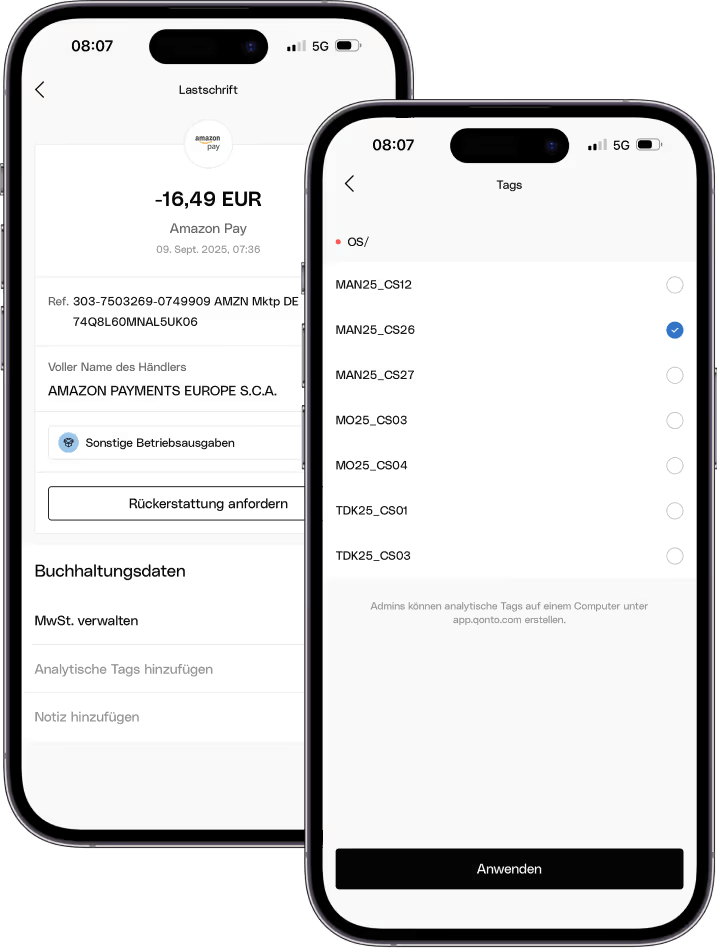 Mit Qonto behaltet ihr all eure Ausgaben im Griff und ordnet jede Kreditkartentransaktion automatisch euren Projekten in OS/ zu. So habt ihr ohne Aufwand und in Echtzeit volle Transparenz über alle Projektkosten.