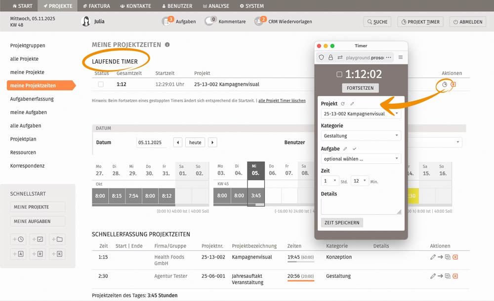 Den Timer gestoppt und vergessen? Das Fenster versehentlich geschlossen? Ab jetzt kein Problem mehr! Die Zeiten der laufenden Timer bleiben im Hintergrund erhalten. Wie gewohnt ist die Liste der Timer im Bereich »meine Projektzeiten« zu finden, in der die Daten automatisch im Minutentakt aktualisiert werden. So kann der Timer auch im Hintergrund fortlaufen und später gespeichert werden.