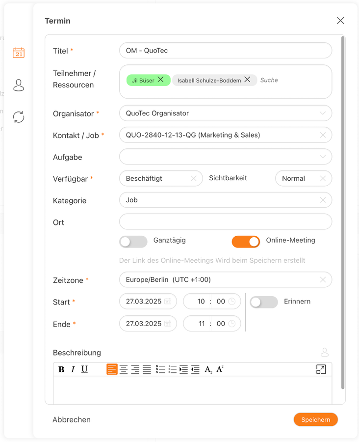 Der QuoJob Kalender bietet Ihnen nicht nur alle Standardfunktionen eines Agenturkalenders, sondern vieles mehr. Natürlich können Sie jobbezogene Termine für sich, ein ganzes Team oder Kollegen anlegen. Sie können mit der Exchange Anbindung aber eben auch eine Synchronisation zu Outlook schaffen.