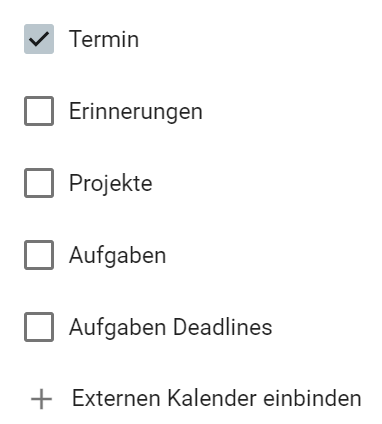 - Im Kalender können neben „normalen“ Terminen auch Erinnerungen, laufende Projekte, Aufgaben und die Deadlines der Aufgaben eingeblendet werden